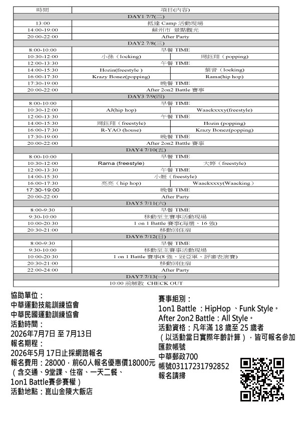 營期間設有 2 on 2 與 1 on 1 Battle 及國際交流對抗賽,讓參與者在實際競技中提升臨場反應、舞台表現與個人風格;同時透過晚間 Battle 活動與 DJ After Party,重現街舞文化中派對精神與社群互動的核心價值。