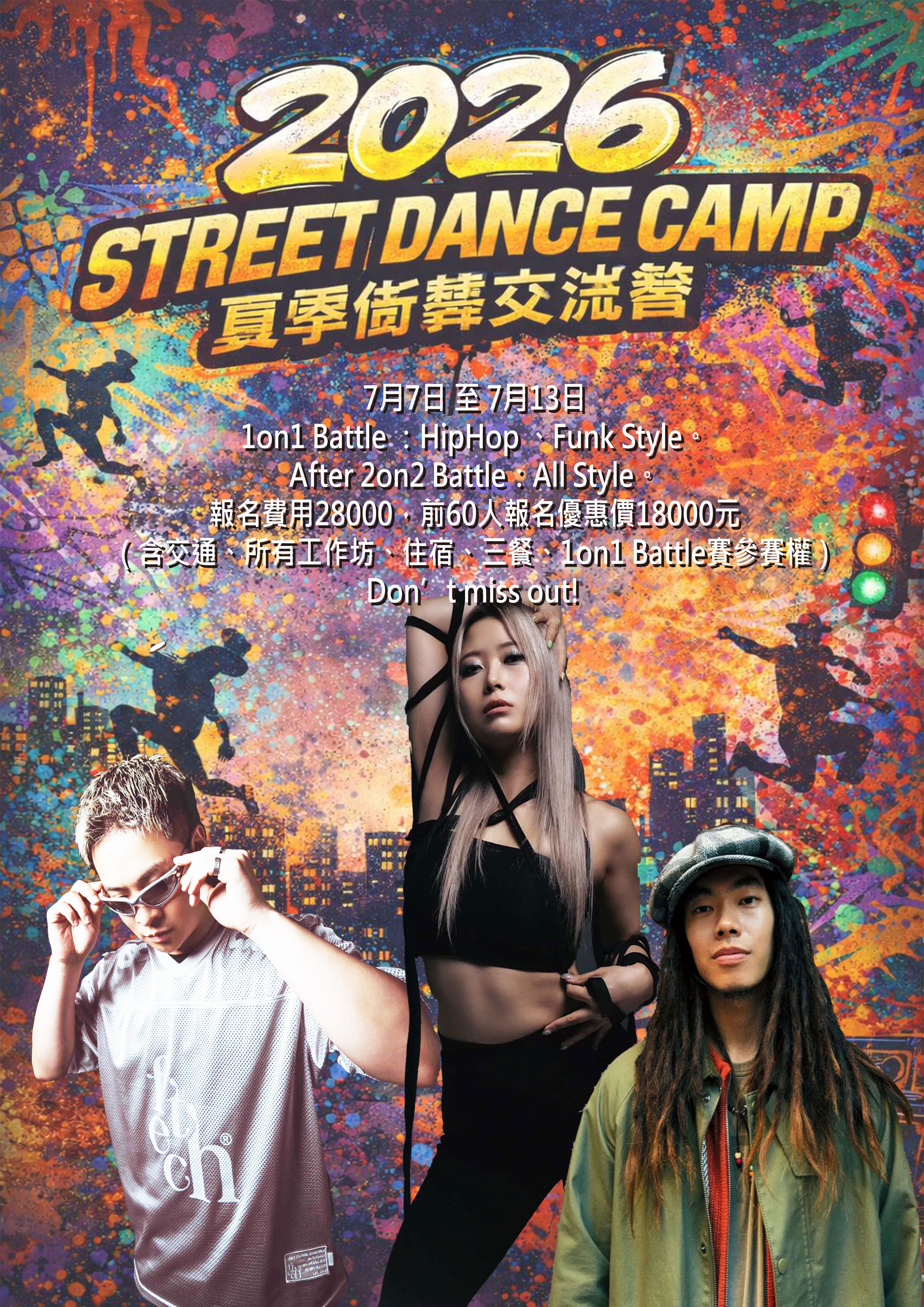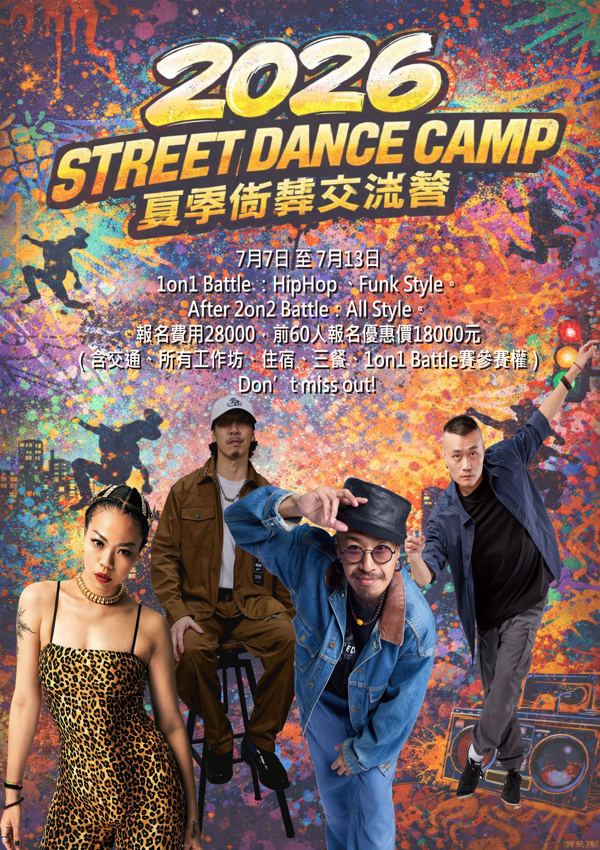 街舞交流營 STREET DANCE CAMP 以推動街舞文化交流、專業培訓與原始精神傳承為核心目的,透過邀請兩岸及國際具代表性的成熟舞者擔任教練與評審,規劃大師級工作坊(Workshop)、3 天系統化舞蹈課程、2 天競技賽事及多元交流活動,提供舞者從學習到實戰的完整體驗。